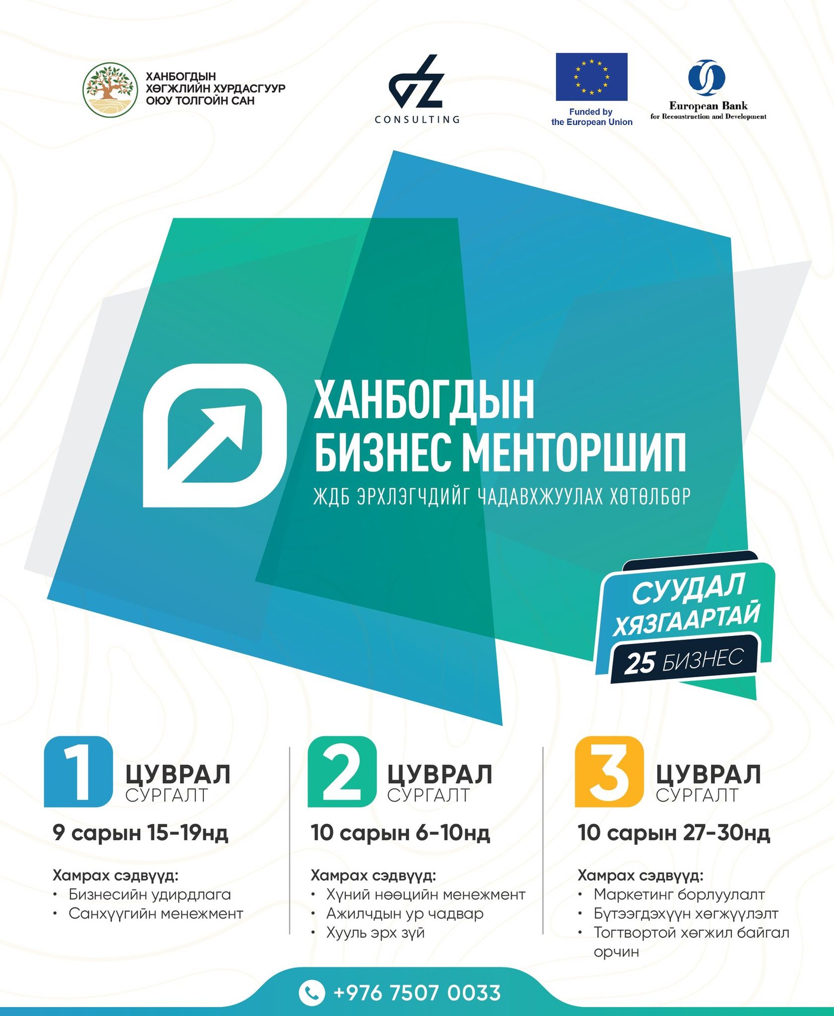 ЕСБХБ болон Ханбогдын хөгжлийн хурдасгуур Оюу толгойн сан хамтран санхүүжүүлж, Ди Зэт Консалтинг-тай хамтран хэрэгжүүлж буй “Ханбогдын бизнес менторшип” хөтөлбөрийн эхний шатны сургалт 9-р сарын 15–17-нд Ханбогд суманд амжилттай зохион байгуулагдлаа.