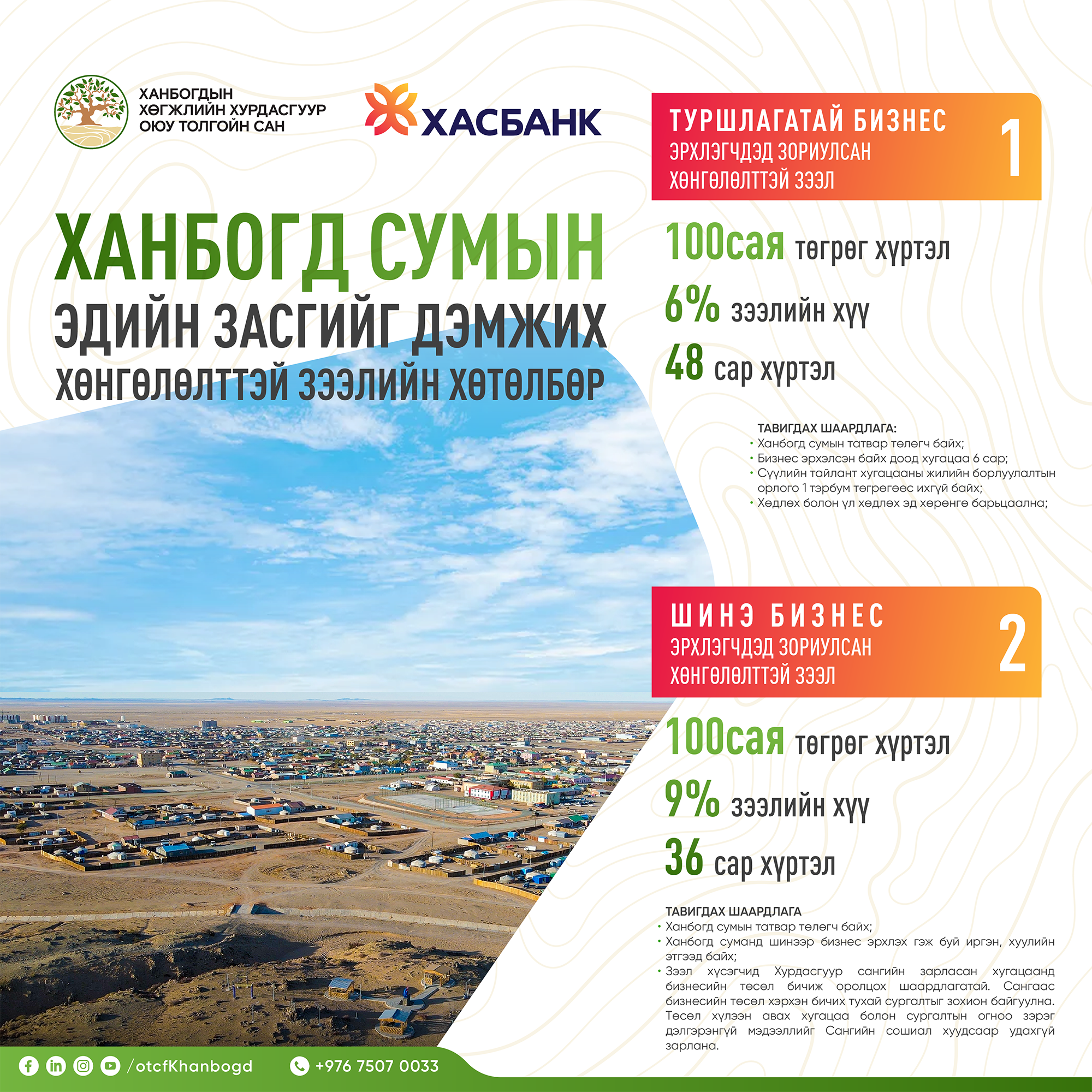 Ханбогдын Хөгжлийн Хурдасгуур Оюу Толгойн Сан нь Ханбогд сумын эдийн засгийг солонгоруулж, бизнесийн орчныг сайжруулах, ажлын байрыг нэмэгдүүлэх зорилгоор Хасбанктай хамтран хөнгөлөлттэй зээлийн бүтээгдэхүүнийг суманд үйл ажиллагаа явуулж буй болон явуулах төлөвлөгөөтэй бизнес эрхлэгчдэд санал болгож эхэллээ. Зээл авах хүсэлтэй аж ахуй нэгж болон иргэд та бүхэн Ханбогд сумын Хасбанкны салбарт хандаарай.